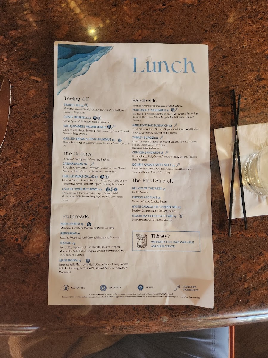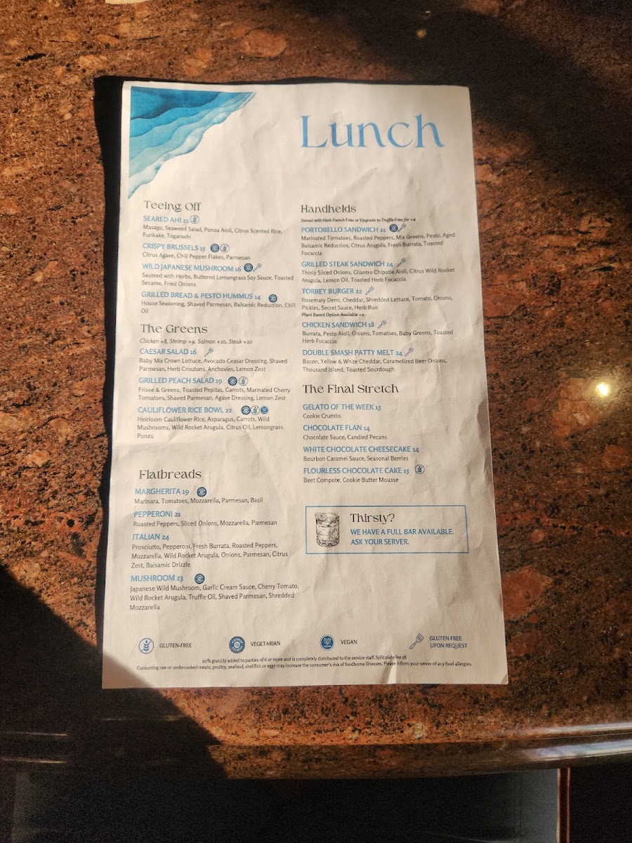 Overall, the menu reflects an inviting atmosphere where guests can enjoy familiar flavors with a subtle coastal twist, whether dining indoors with views of the golf course and sunset or outside in a relaxed setting.