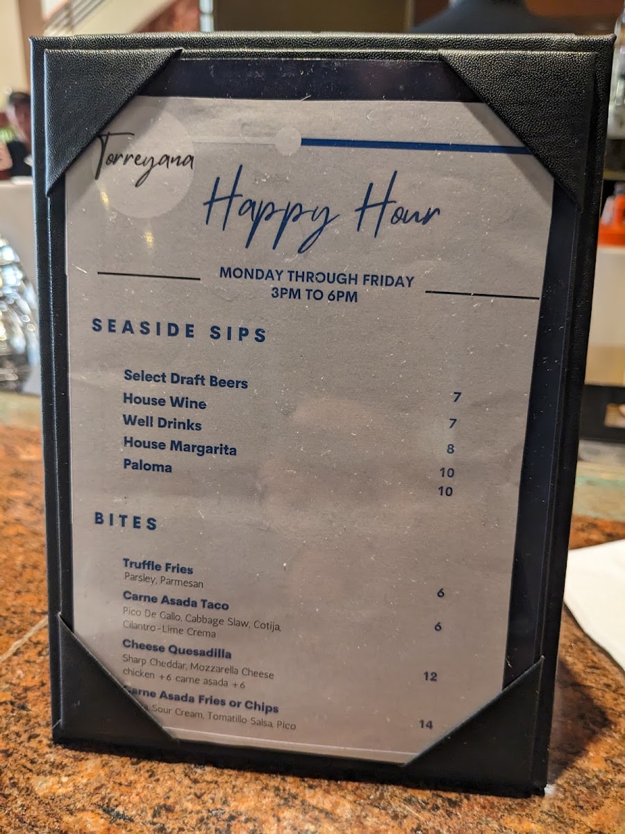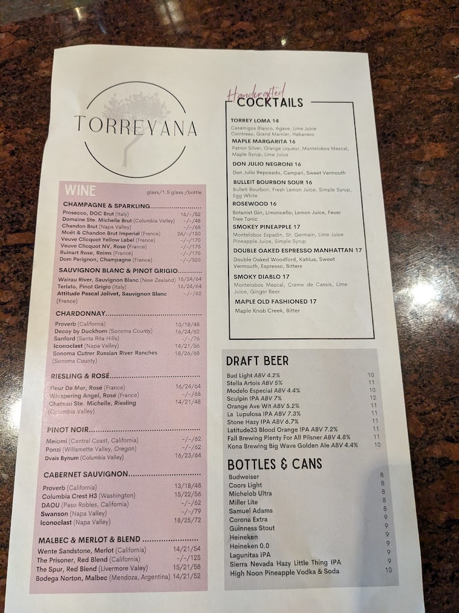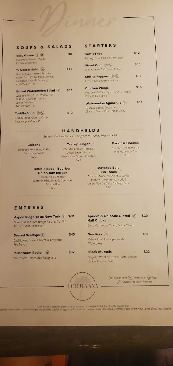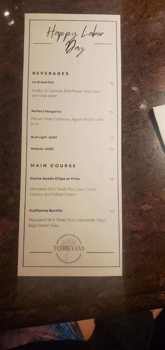 The menu at Torreyana offers a blend of approachable dishes that suit both relaxed breakfasts and casual dinners, thoughtfully curated to complement the serene coastal setting. Guests can expect a range of classic yet refined options that balance fresh, local ingredients with familiar flavors.